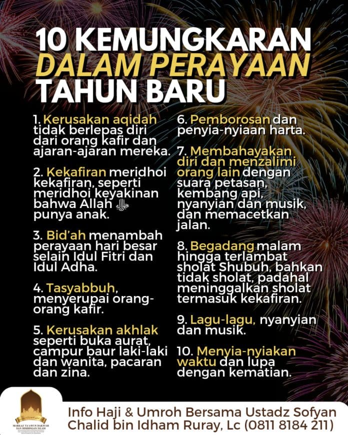 4. Tasyabbuh, menyerupai orang-orang kafir dalam merayakannya, berpesta pora, berpakaian seperti mereka, meniup terompet, saling memberi hadiah, memberi diskon penjualan, ucapan selamat dan libur kerja karena momen Natal atau Tahun Baru dan lain-lain.