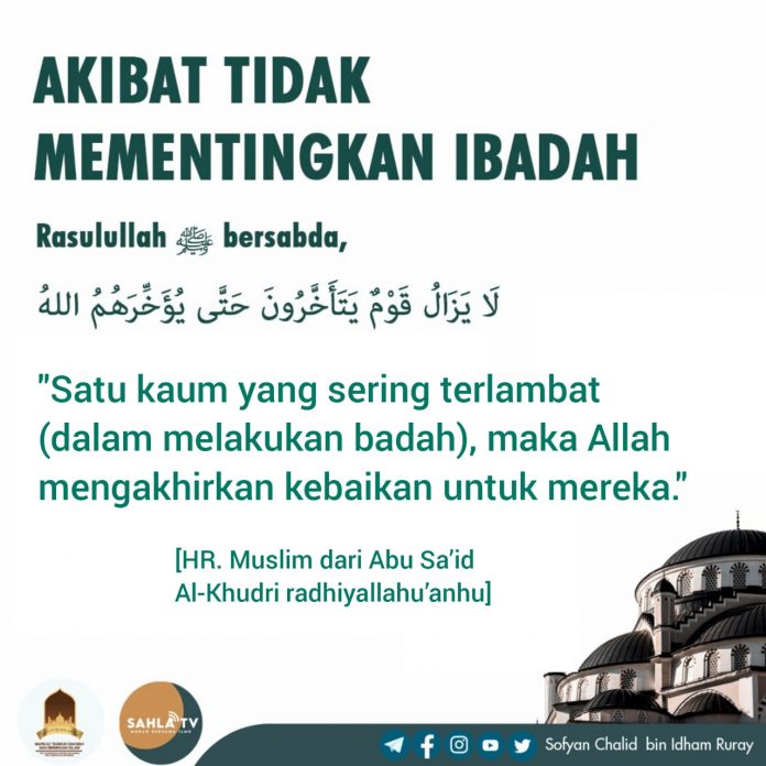 “Satu kaum yang sering terlambat (dalam melakukan ibadah), maka Allah mengakhirkan kebaikan untuk mereka.” [HR. Muslim dari Abu Sa’id Al-Khudri radhiyallahu’anhu]