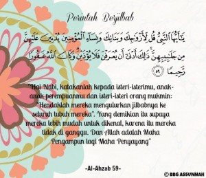 “Wahai Nabi katakanlah kepada istri-istrimu, anak-anak perempuanmu dan istri-istri orang mukmin: Hendaklah mereka mengulurkan jilbabnya ke seluruh tubuh mereka. Yang demikian itu supaya mereka lebih mudah untuk dikenal, karena itu mereka tidak diganggu. Dan Allah adalah Maha pengampun lagi Maha penyayang.” [Al-Ahzab: 59]