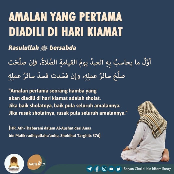 “Amalan pertama seorang hamba yang akan diadili di hari kiamat adalah sholat. Jika baik sholatnya, baik pula seluruh amalannya. Jika rusak sholatnya, rusak pula seluruh amalannya.” [HR. Ath-Thobarani dari Anas radhiyallahu’anhu, Ash-Shahihah: 1358]
