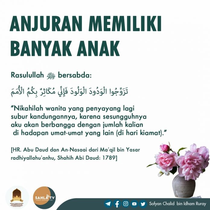 “Nikahilah wanita yang penyayang lagi subur kandungannya, karena sesungguhnya aku akan berbangga dengan jumlah kalian di hadapan umat-umat yang lain (di hari kiamat).” [HR. Abu Daud dan An-Nasaai dari Ma’qil bin Yasar radhiyallahu’anhu, Shahih Abi Daud: 1789]