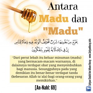 Madu, adalah sebuah kata yang bisa bermakna sesuatu yang manis (bagi orang yang memahami hakikatnya) dan bisa pula berarti sesuatu yang pahit (bagi orang yang belum memahami hakikatnya). Dan sepanjang yang saya ketahui, semua madu bermakna manis insya Allah ta’ala, bahkan manfaatnya banyak sekali.