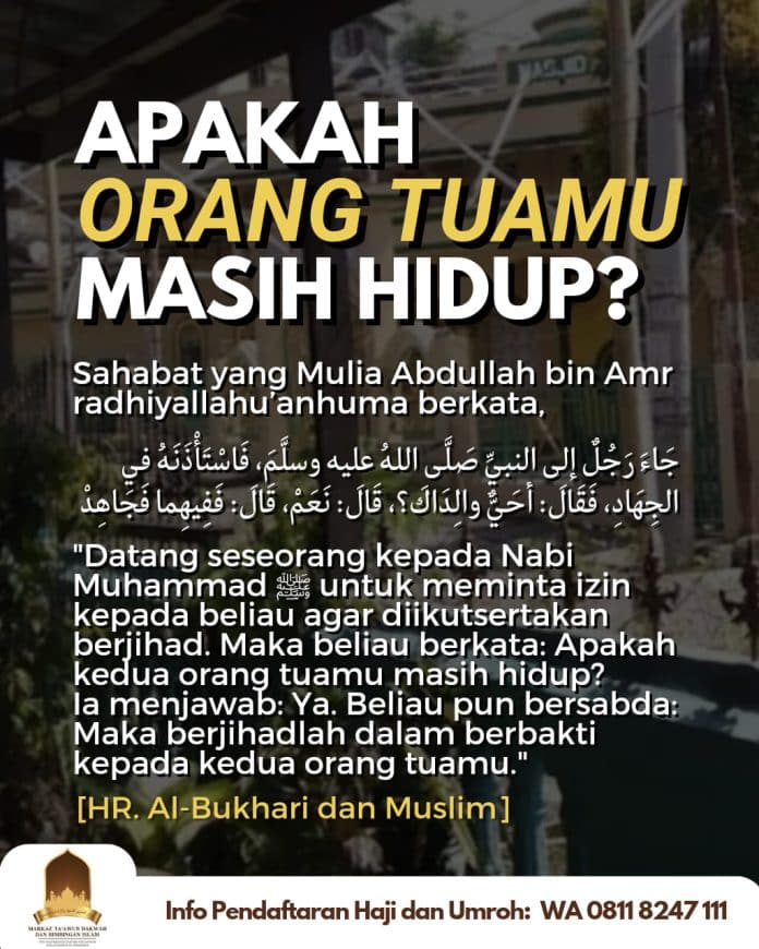 “Datang seseorang kepada Nabi Muhammad ﷺ untuk meminta izin kepada beliau agar diikutsertakan berjihad. Maka beliau berkata: Apakah kedua orang tuamu masih hidup? Ia menjawab: Ya. Beliau pun bersabda: Maka berjihadlah dalam berbakti kepada kedua orang tuamu.” [HR. Al-Bukhari dan Muslim]