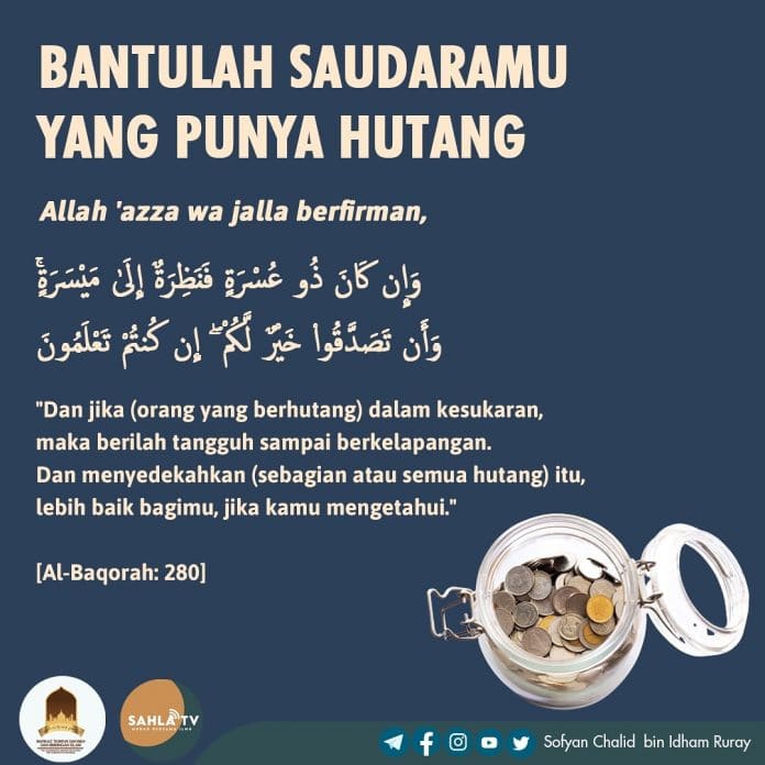 “Dan jika (orang yang berhutang) dalam kesukaran, maka berilah tangguh sampai ia berkelapangan. Dan menyedekahkan (sebagian atau semua hutang) itu, lebih baik bagimu, jika kamu mengetahui.” [Al-Baqorah: 280]
