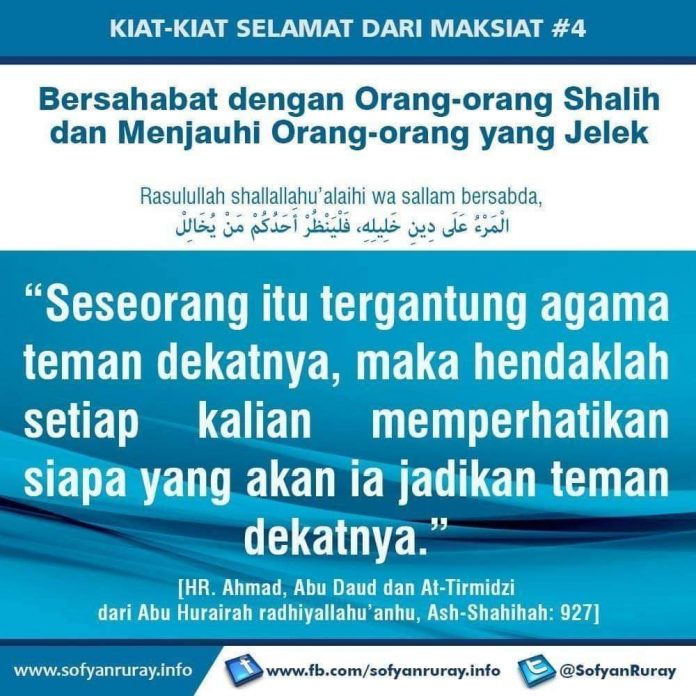 “Seseorang itu tergantung agama teman dekatnya, maka hendaklah setiap kalian memperhatikan siapa yang akan ia jadikan teman dekatnya.” [HR. Ahmad, Abu Daud dan At-Tirmidzi dari Abu Hurairah radhiyallahu’anhu, Ash-Shahihah: 927]