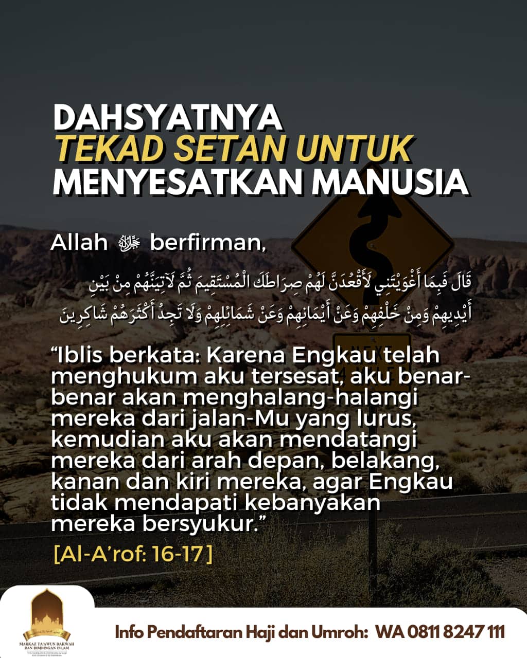 “Iblis berkata: Karena Engkau telah menghukum aku tersesat, aku benar-benar akan menghalang-halangi mereka dari jalan-Mu yang lurus, kemudian aku akan mendatangi mereka dari arah depan, belakang, kanan dan kiri mereka, agar Engkau tidak mendapati kebanyakan mereka bersyukur.” [Al-A’rof: 16-17]