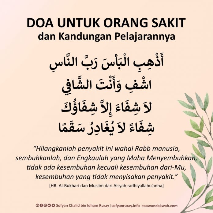 “Hilangkanlah penyakit ini wahai Rabb manusia, sembuhkanlah, dan Engkaulah yang Maha Penyembuh, tidak ada kesembuhan kecuali kesembuhan dari-Mu, kesembuhan yang tidak menyisakan penyakit.” [HR. Al-Bukhari dan Muslim]