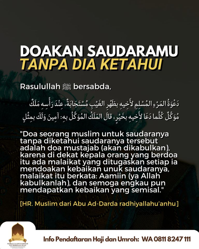 “Tidaklah seorang hamba muslim mendoakan kebaikan untuk saudaranya tanpa dia ketahui, kecuali malaikat akan berkata: Semoga engkau mendapatkan yang semisal.” [HR. Muslim dari Abu Ad-Darda radhiyallahu’anhu]
