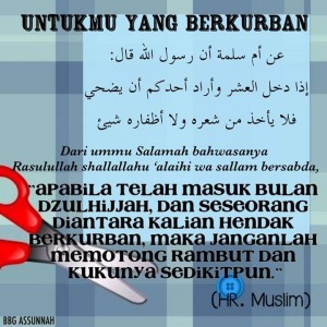 “Apabila telah masuk sepuluh hari pertama bulan Dzulhijjah, dan salah seorang dari kalian telah berniat untuk berqurban, maka janganlah ia memotong rambutnya dan kulitnya sedikitpun.” [HR. Muslim dari Ummu salamah radhiyallahu’anha]