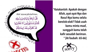 ?”Katakanlah: Apakah dengan Allah, ayat-ayat-Nya dan Rasul-Nya kamu selalu berolok-olok? Tidak usah kamu minta maaf, karena kamu kafir sesudah beriman.” [At-Taubah: 65-66]