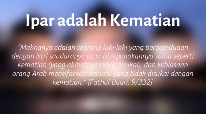 بِسْمِ اللَّهِ الرَّحْمَنِ الرَّحِيمِ Rasulullah shallallahu’alaihi wa sallam bersabda, إيَّاكُمْ والدخول على النساءِ فقالَ رجلٌ منَ الأنصار يا رسولَ الله أفرأيتَ الْحَمُو قالَ الْحَمُو الموت “Janganlah kalian memasuki tempat para wanita. Maka berkata seorang lelaki dari kaum Anshar: Wahai Rasulullah, bagaimana dengan ipar? Rasulullah shallallahu’alaihi wa sallam berkata: Ipar adalah kematian.” [HR. Al-Bukhari dan Muslim … Continue reading Ipar adalah Kematian