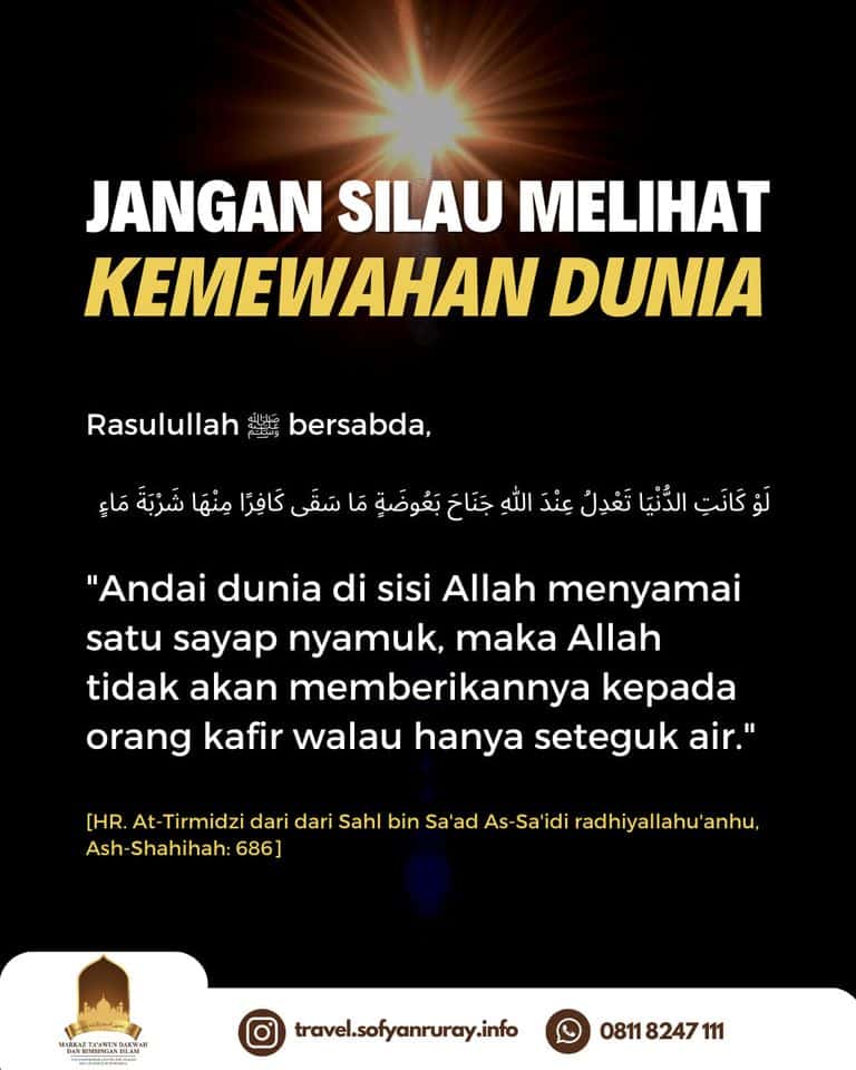 “Andai dunia di sisi Allah menyamai satu sayap nyamuk, maka Allah tidak akan memberikannya kepada orang kafir walau hanya seteguk air.” [HR. At-Tirmidzi dari dari Sahl bin Sa’ad As-Sa’idi radhiyallahu’anhu, Ash-Shahihah: 686]