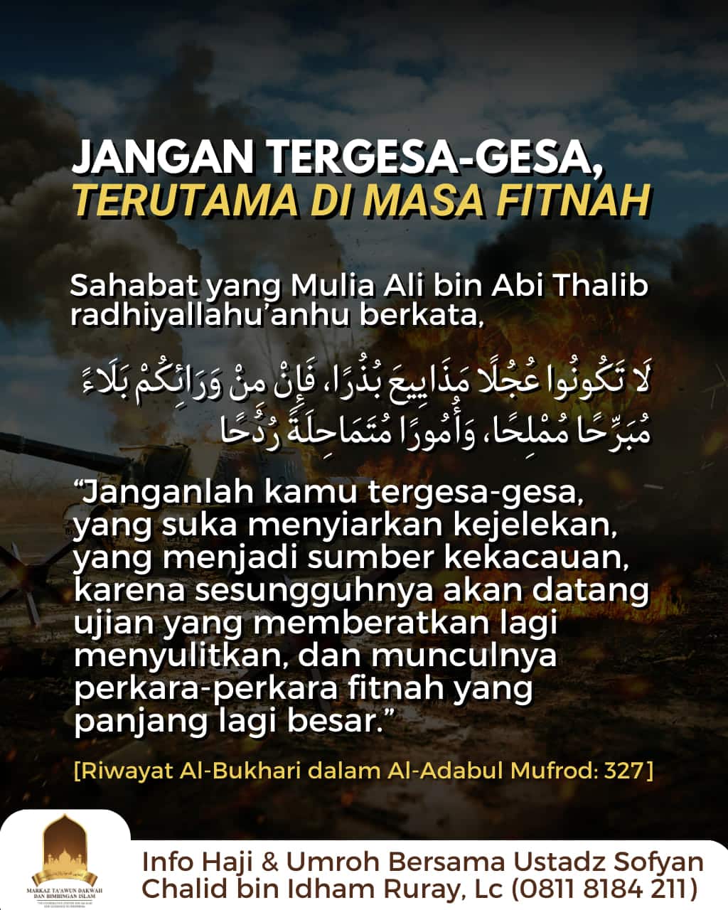 “Janganlah kamu tergesa-gesa, yang suka menyiarkan kejelekan, yang menjadi sumber kekacauan, karena sesungguhnya akan datang ujian yang memberatkan lagi menyulitkan, dan munculnya perkara-perkara fitnah yang panjang lagi besar.” [Riwayat Al-Bukhari dalam Al-Adabul Mufrod: 327]