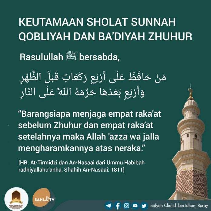 “Barangsiapa menjaga empat raka’at sebelum Zhuhur dan empat raka’at setelahnya maka Allah mengharamkannya atas neraka.” [HR. At-Tirmidzi dan An-Nasaai dari Ummu Habibah radhiyallahu’anha, Shahih An-Nasaai: 1811]