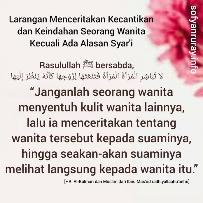 “Janganlah seorang wanita menyentuh kulit wanita lainnya, lalu ia menceritakan tentang wanita tersebut kepada suaminya, hingga seakan-akan suaminya melihat langsung kepada wanita itu.” [HR. Al-Bukhari dan Muslim dari Abdullah bin Mas’ud radhiyallaahu’anhu]