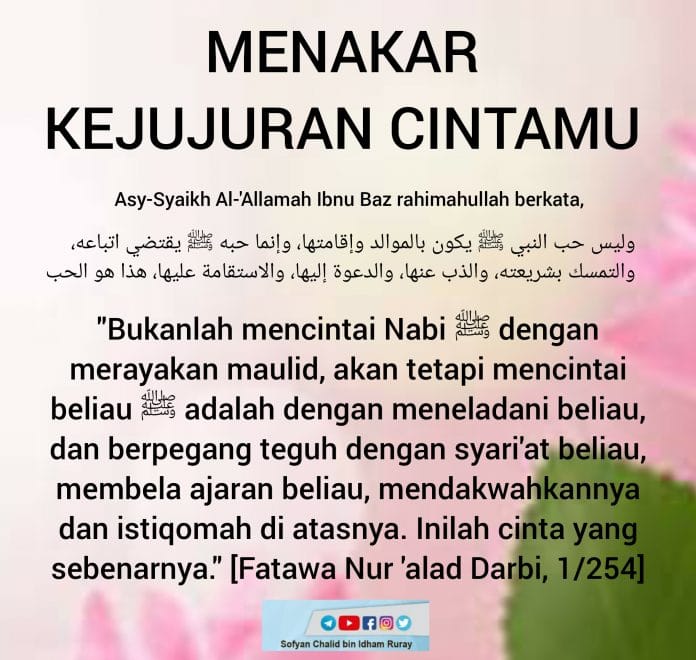 “Bukanlah mencintai Nabi ﷺ dengan merayakan maulid, akan tetapi mencintai beliau ﷺ adalah dengan meneladani beliau, dan berpegang teguh dengan syari’at beliau, membela ajaran beliau, mendakwahkannya dan istiqomah di atasnya. Inilah cinta yang sebenarnya,