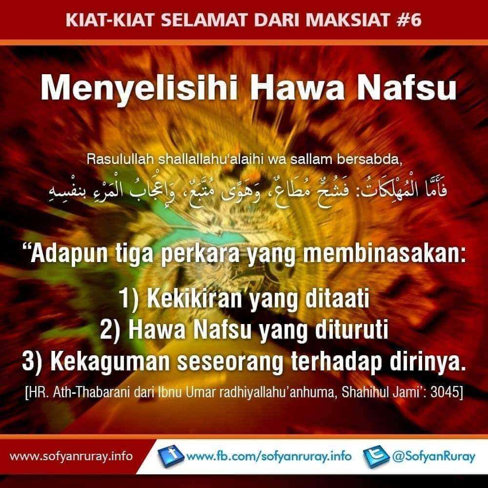 “Dan janganlah kamu mengikuti hawa nafsu, karena ia akan menyesatkan kamu dari jalan Allah. Sesungguhnya orang-orang yang sesat dari jalan Allah akan mendapat azab yang berat, karena mereka melupakan hari perhitungan.” [Shod: 26]