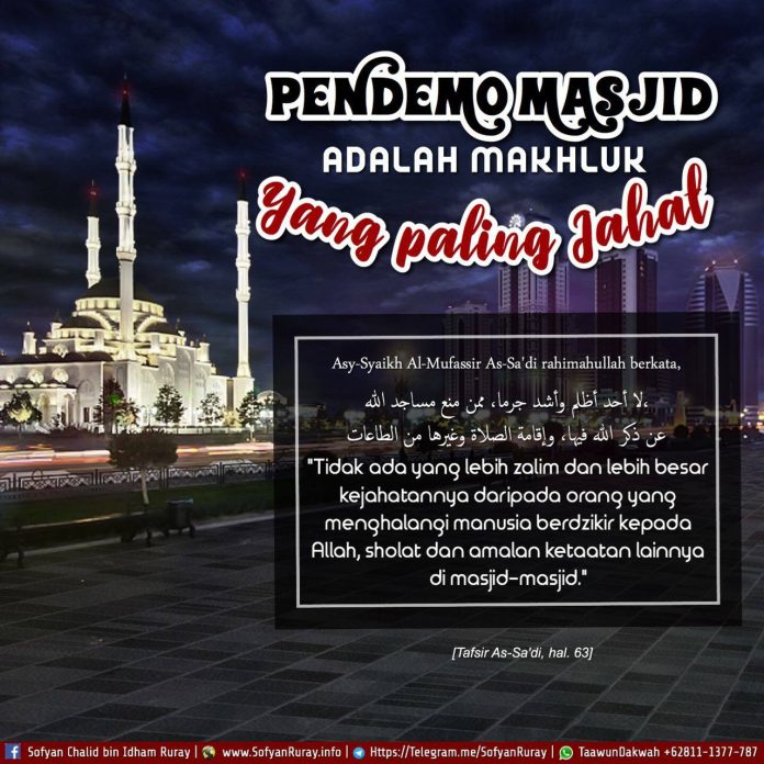 “Tidak ada yang lebih zalim dan lebih besar kejahatannya daripada orang yang menghalangi manusia berdzikir kepada Allah, sholat dan amalan ketaatan lainnya di masjid-masjid.” [Tafsir As-Si’di, hal. 63]
