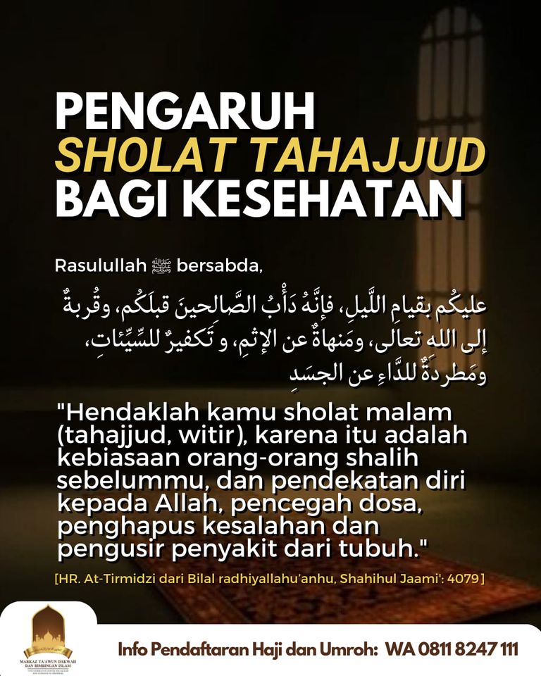 “Shalat malam termasuk sebab yang paling bermanfaat untuk menjaga kesehatan, mencegah berbagai penyakit berat, dan membangkitkan semangat bagi tubuh, ruh dan hati.” [Zaadul Ma’ad, 4/227]