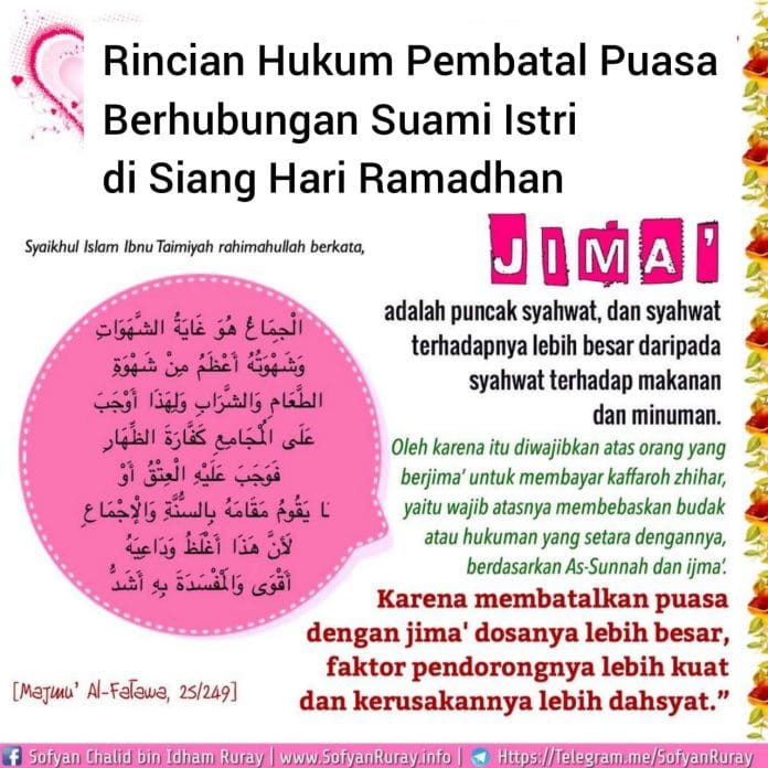 Bahkan jima’ adalah puncak syahwat, dan syahwat terhadapnya lebih besar daripada syahwat terhadap makanan dan minuman, oleh karena itu diwajibkan atas orang yang berjima’ membayar kaffaroh zhihar, yaitu wajib atasnya membebaskan budak atau yang dapat menggantikan kedudukannya (yaitu hukuman yang setara dengannya) berdasarkan As-Sunnah dan ijma’, karena ia lebih besar dosanya, faktor pendorongnya lebih kuat dan kerusakannya lebih dahsyat.” [Majmu’ Al-Fatawa, 25/249]
