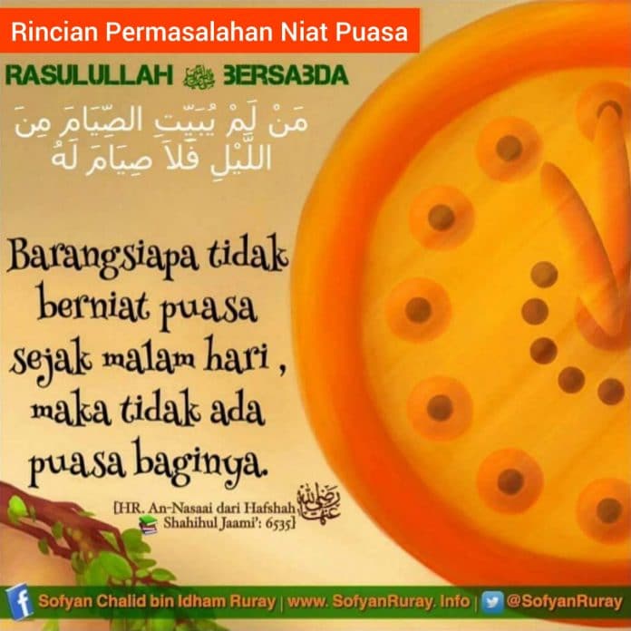 “Barangsiapa tidak berniat puasa sejak malam hari maka tidak ada puasa baginya.” [HR. An-Nasaai dari Hafshah radhiyallahu’anha, Shahihul Jaami’: 6535]