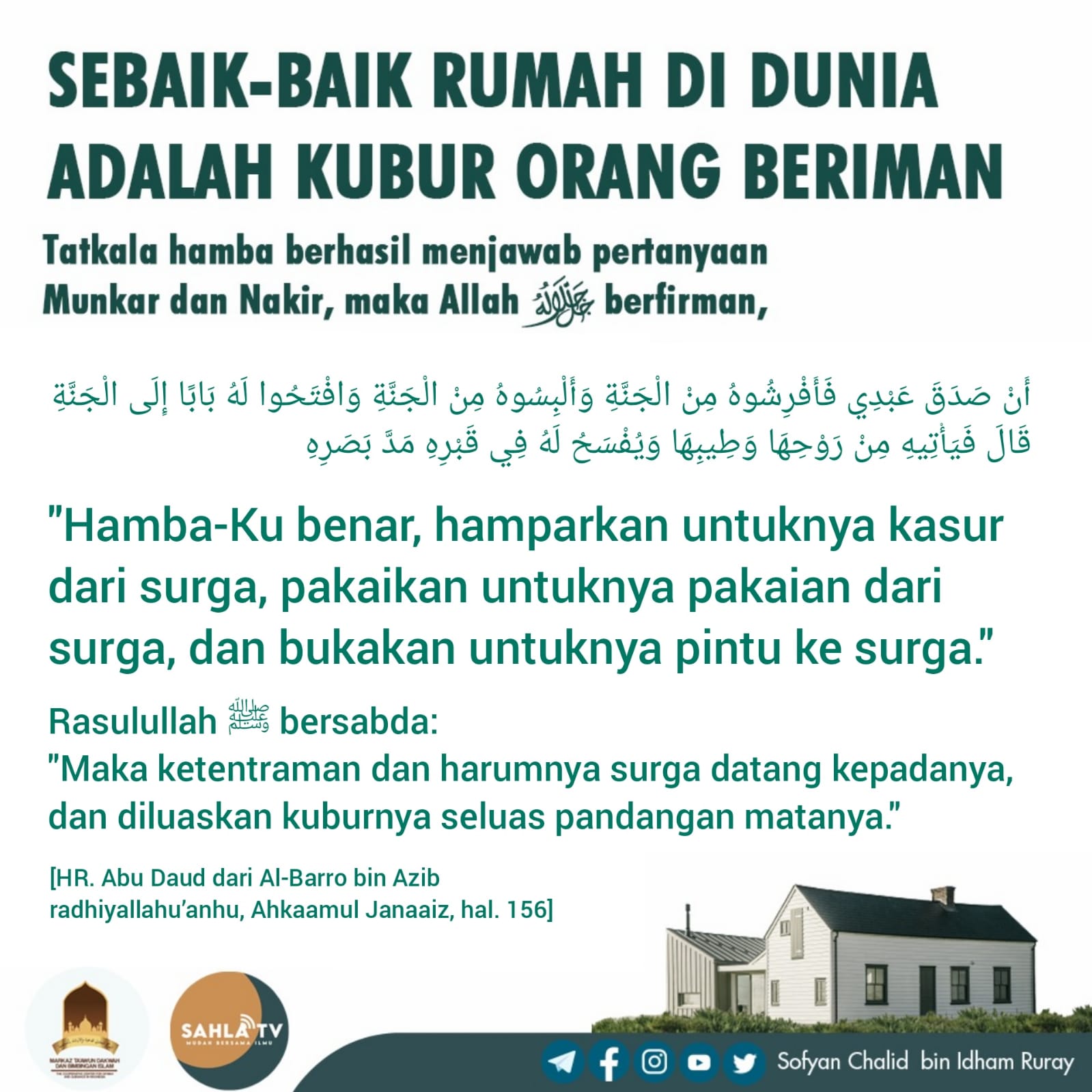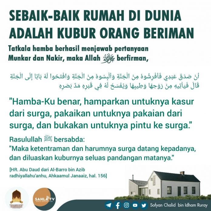 “Tidak ada rumah yang lebih baik bagi orang beriman daripada kubur yang padanya ia beristirahat dari segala kesusahan dunia dan aman dari azab Allah.” [Al-Qubuur, Ibnu Abid Dunya: 141]