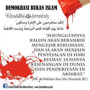 Islam telah memperingatkan untuk berhati-hati dari kekuasaan, tidak setiap orang berhak memangkunya. Islam mengajarkan untuk tidak berambisi dengan kekuasaan, pertanggungjawabnnya sangat berat di hari kiamat, tetapi demokrasi malah sebaliknya, memotivasi untuk berambisi, mengejar, meminta bahkan mengemis jabatan kepada masyarakat.
