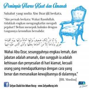 “Aku pernah berkata: Wahai Rasulullah, tidakkah engkau mengangkatku menjadi pejabat? Beliau menepuk bahuku dengan tangannya kemudian bersabda: Wahai Abu Dzar, sesungguhnya engkau lemah, dan jabatan adalah amanah, dan sungguh ia adalah kehinaan dan penyesalan di hari kiamat, kecuali orang yang mendapatkannya dengan cara yang benar dan menunaikan kewajibannya di dalamnya.” [HR. Muslim]