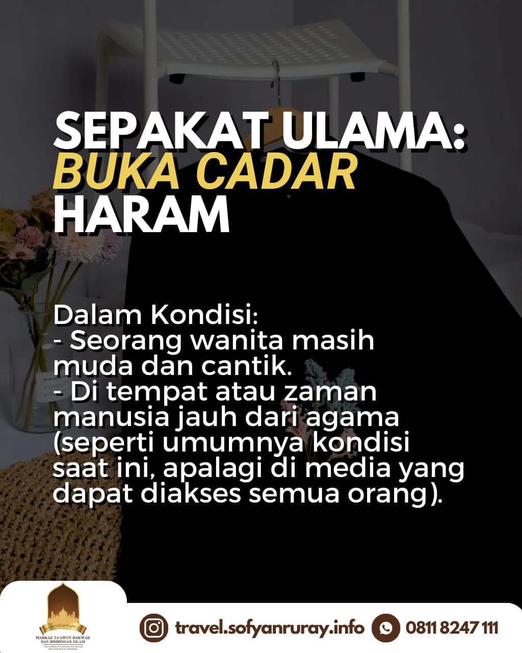 “Tidak ada seorang ulama Islam pun yang berpendapat bolehnya wanita membuka wajah dan tangannya dalam kondisi: