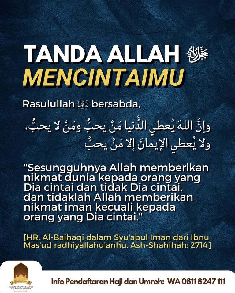 “Sesungguhnya Allah memberikan nikmat dunia kepada orang yang Dia cintai dan tidak Dia cintai, dan tidaklah Allah memberikan nikmat iman kecuali kepada orang yang Dia cintai.” [HR. Al-Baihaqi dalam Syu’abul Imam dari Ibnu Mas’ud radhiyallahu’anhu, Ash-Shahihah: 2714]